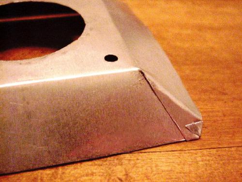 With the nine individual squares, cut from each corner in toward the center on the diagonal lines until you get to the two lines that are parallel to the sides. These cuts should be 1.414" long. Then, bend up one side 45 degrees between the diagonal line cuts, making the bend on the scribed line parallel to the side. Then do the same thing to the opposite side, again making the bend 45 degrees. Next, bend the third side up until it touches the other two side, again making the bend on the scribed line. Now, fold the third side around the first two sides to form a corner of the downward sloping surface. Using a pair of pliers or other tool to make this fold will result in the tips of the two sides protruding beyond the other side so they can act as tabs to be bent back and secure the corner. Figure 2 shows a close-up picture of one of the corners and how the turned-down corners are shaped.
